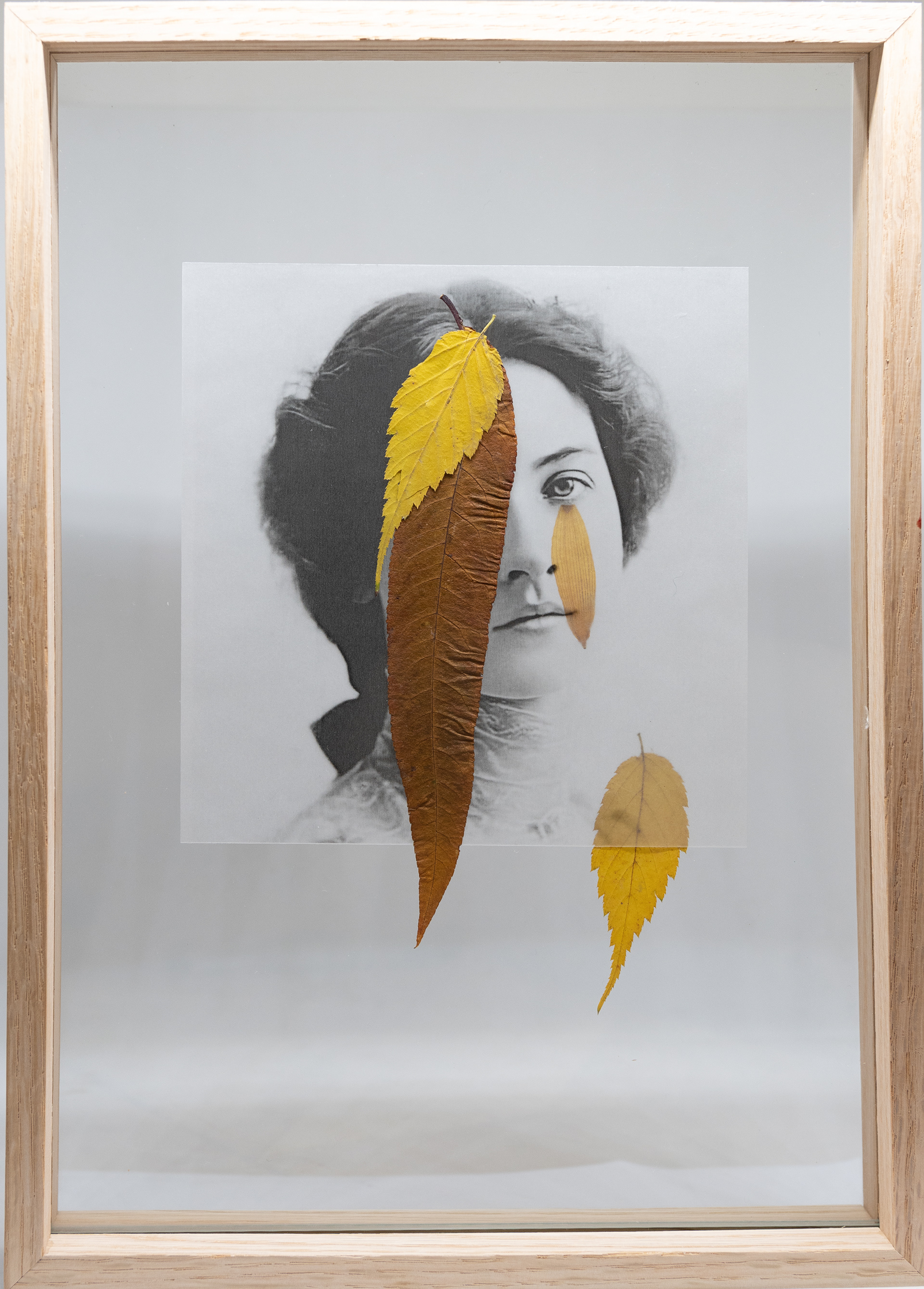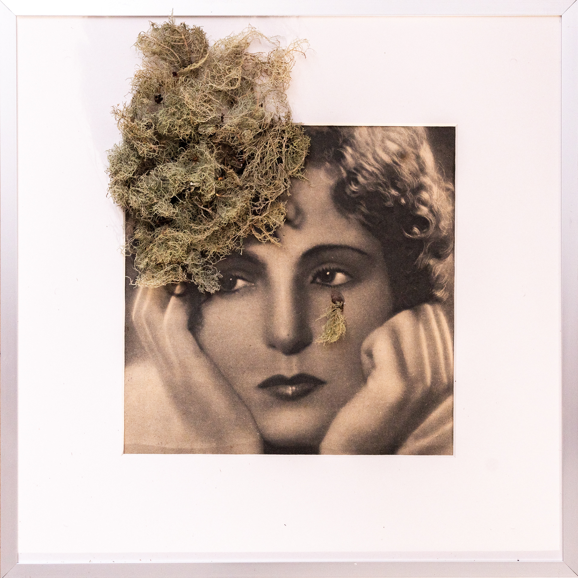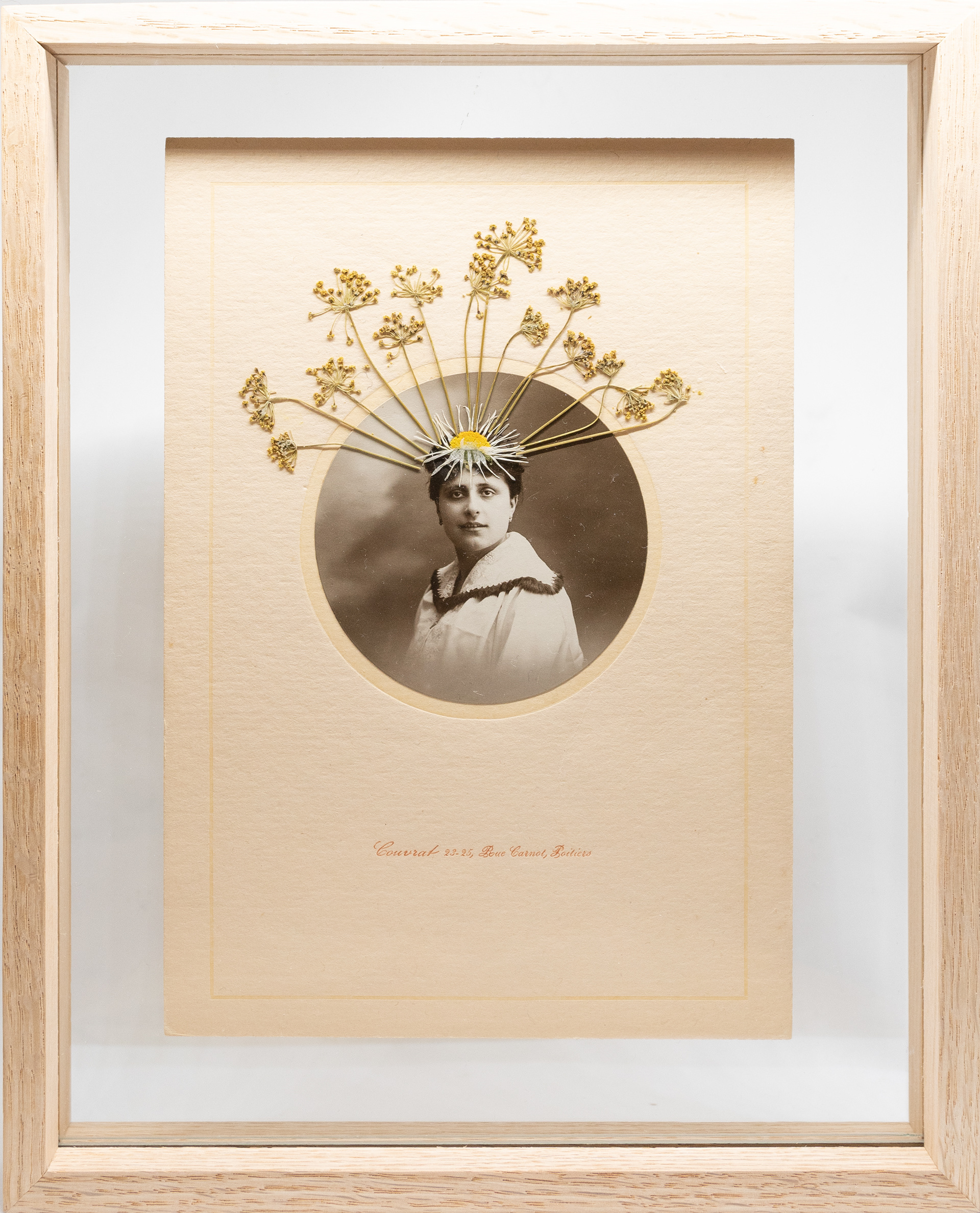 Série de collages. Collages d’herbes et fleurs séchées et pressées sur vieille photographies chinées ou photographies imprimées sur papier calque.