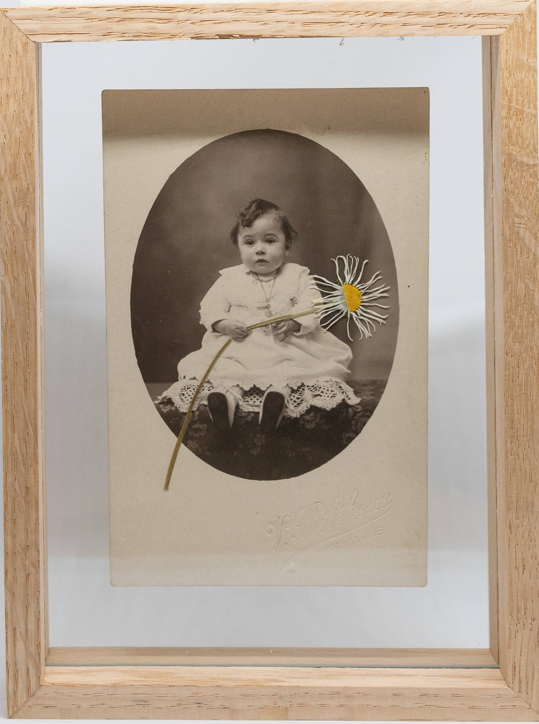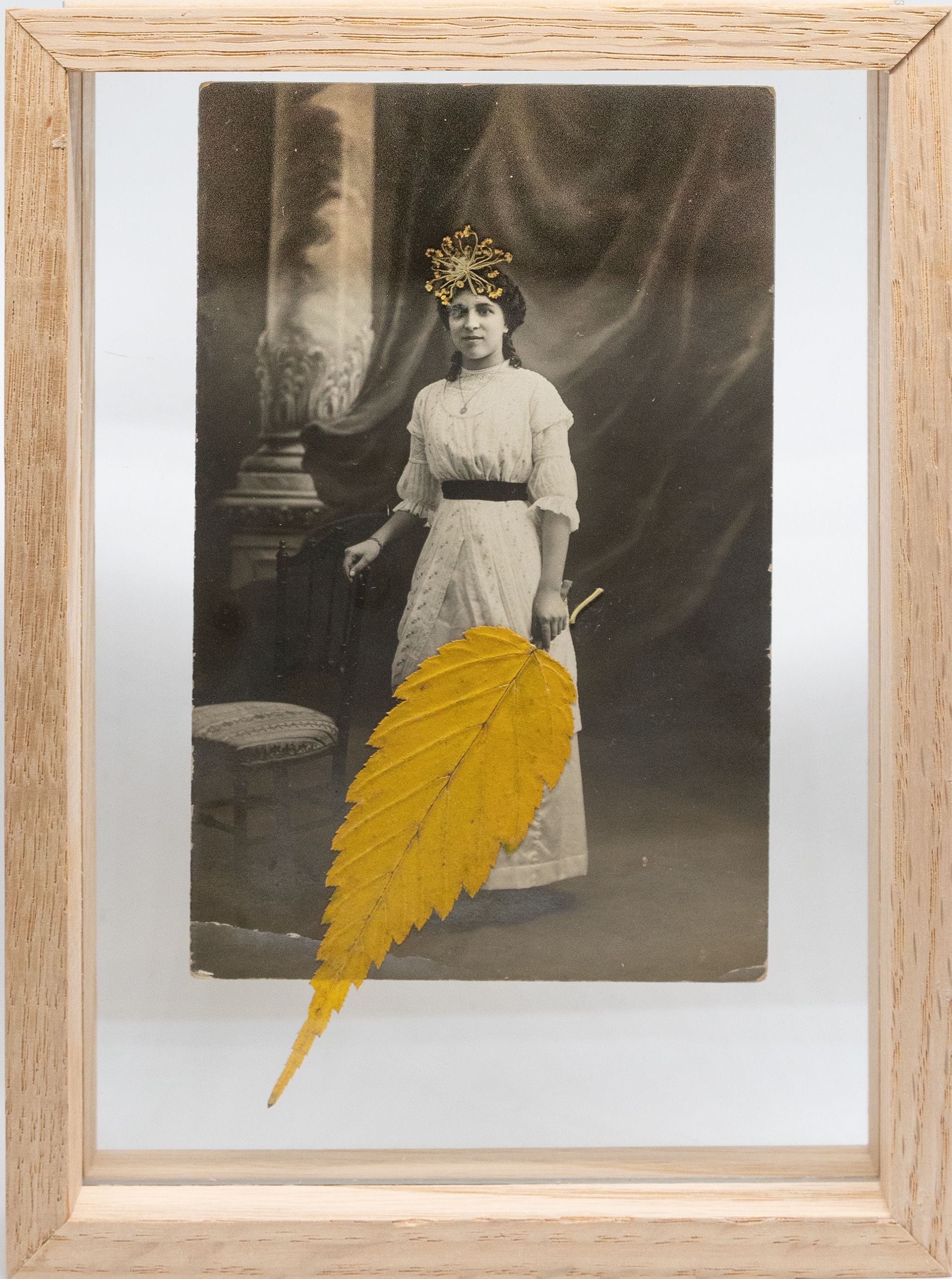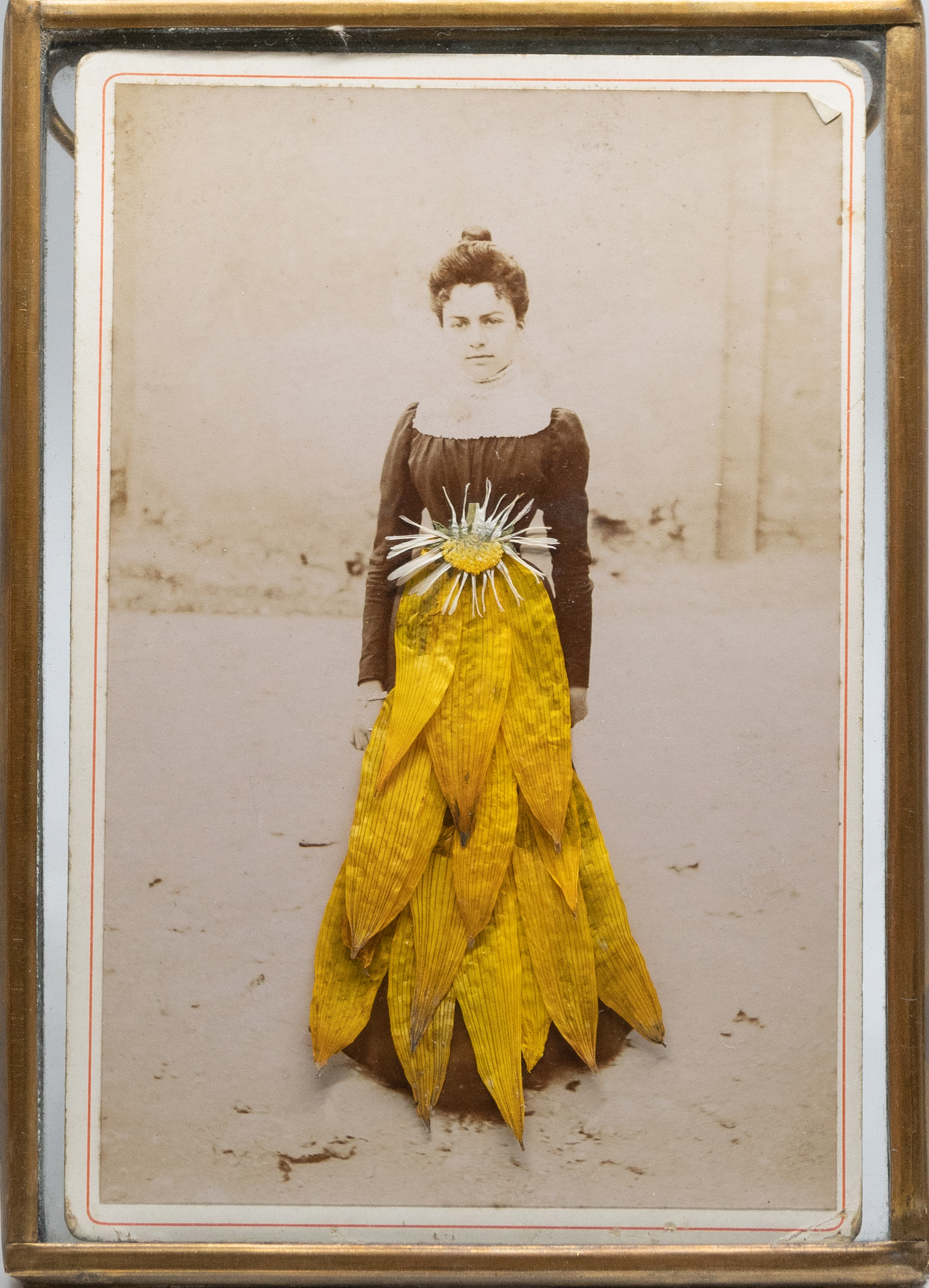 Série de collages. Collages d’herbes et fleurs séchées et pressées sur vieille photographies chinées ou photographies imprimées sur papier calque.